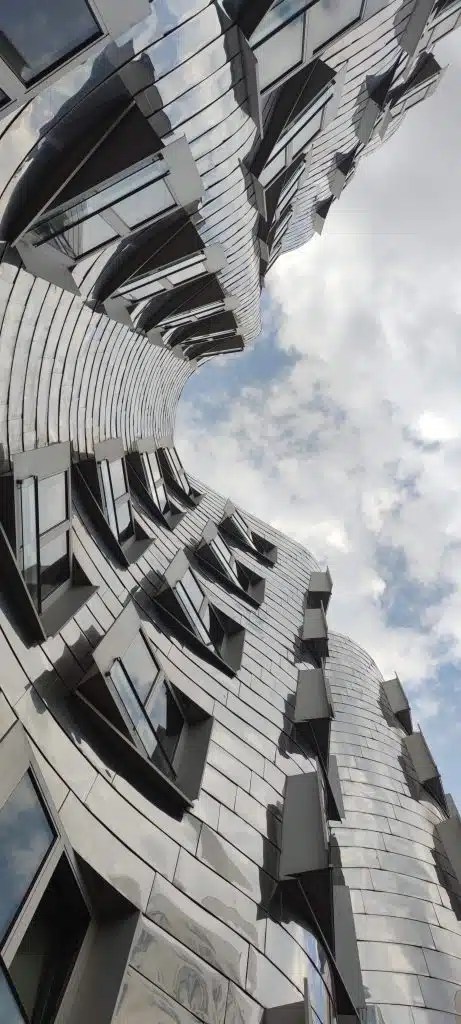 - Justo a unos metros de la torre, se encuentran 3 edificios muy característicos, que vas a identificar a simple vista. Son los edificios del arquitecto Ghery. Si fuiste a Praga, es el mismo arquitecto de «la casa danzante».