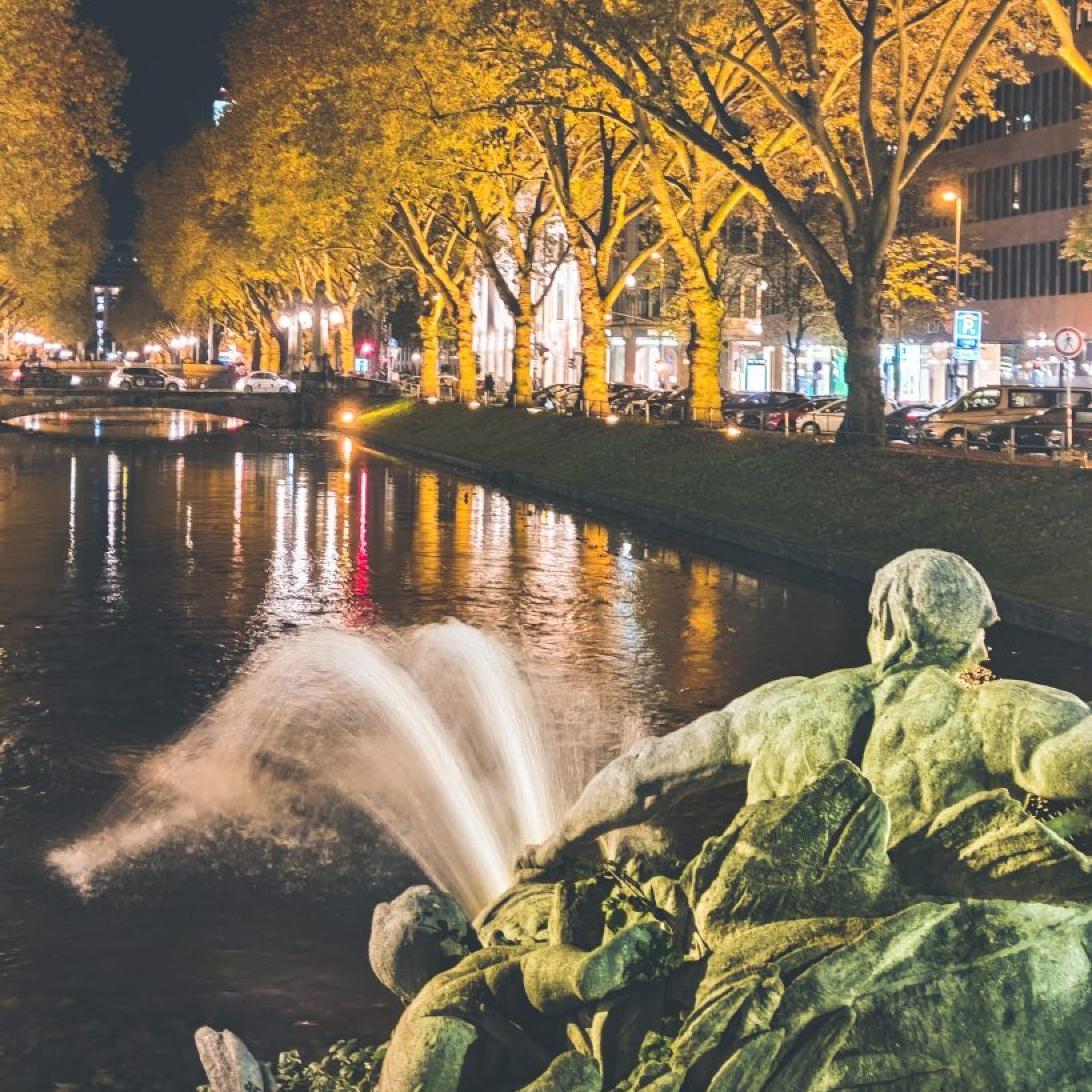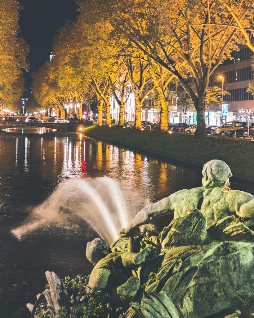 - El día termina con el paseo en la zona más icónica de la ciudad. La avenida Königsalle - localmente llamada KÖ - (paseo del rey). Si te toca un fin de semana, es probable que veas el desfile de autos de lujo que suelen pasearse por esta zona.